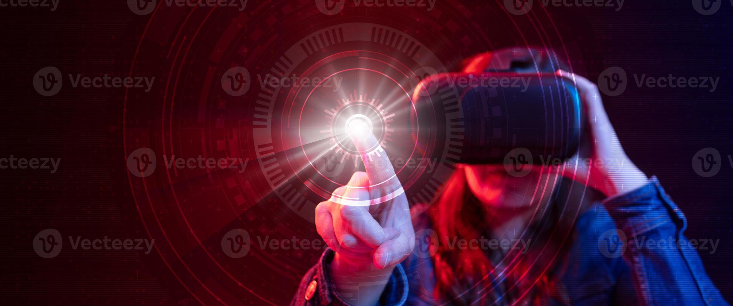 Hispanic woman with virtual reality goggles with digital technology exploring cyberspace in 3D with blue and red light while pressing a button with her finger Pro Photo
