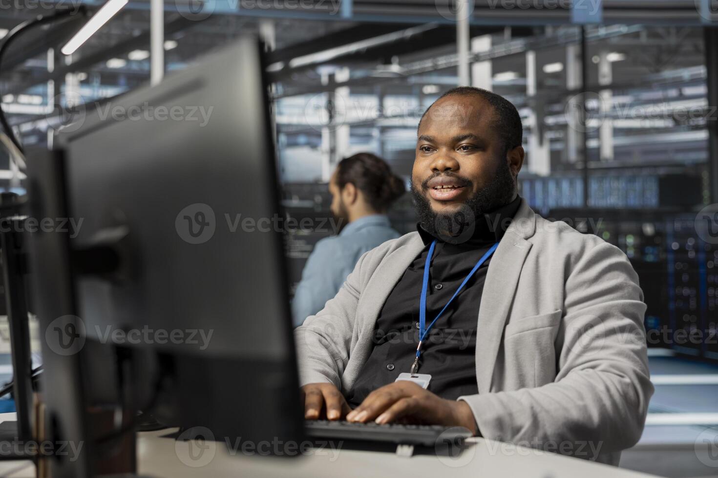 Cheerful data center employee working to update rackmounts software, configuring network virtualization. Upbeat african american man in server room verifying mainframes settings Pro Photo