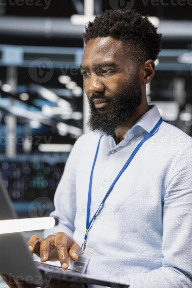 Computer scientist in server room uses laptop to implement and manage data backup solutions. African american man in data center identifying and resolving technical errors, ensuring efficient recovery Pro Photo