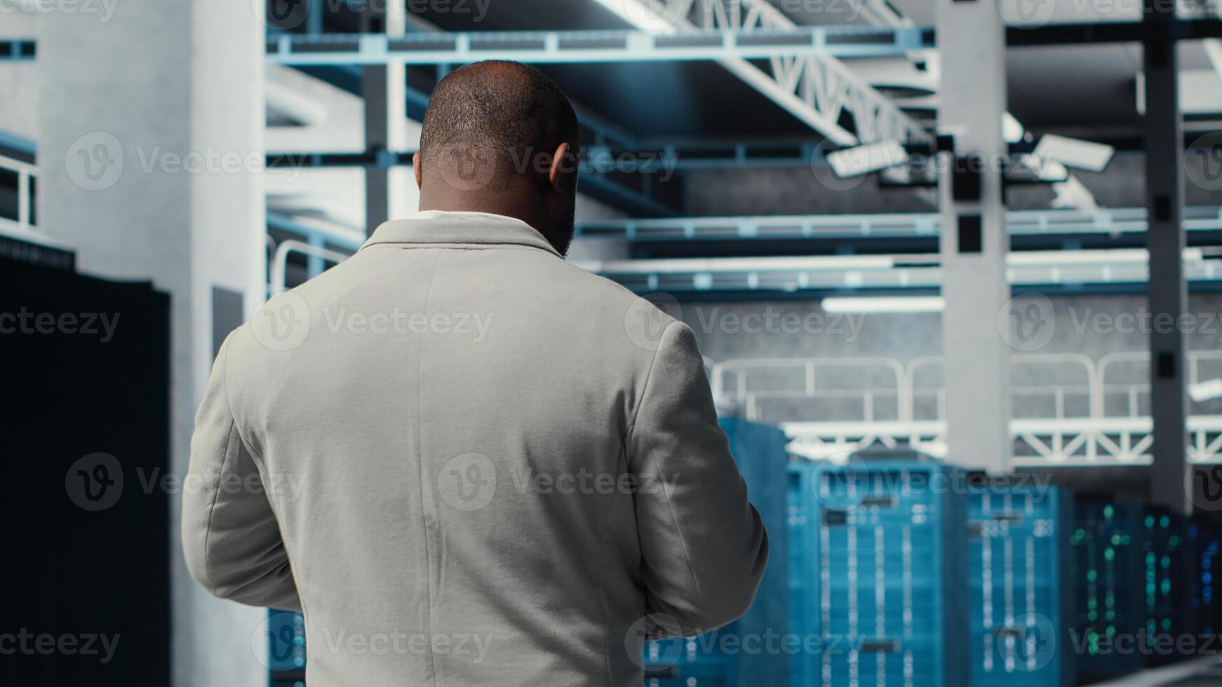 Employee walking in server farm, analyzing equipment metrics on device screen. African american data center engineer doing analysis on tablet using data gathered by infrastructure rigs, camera B Pro Photo
