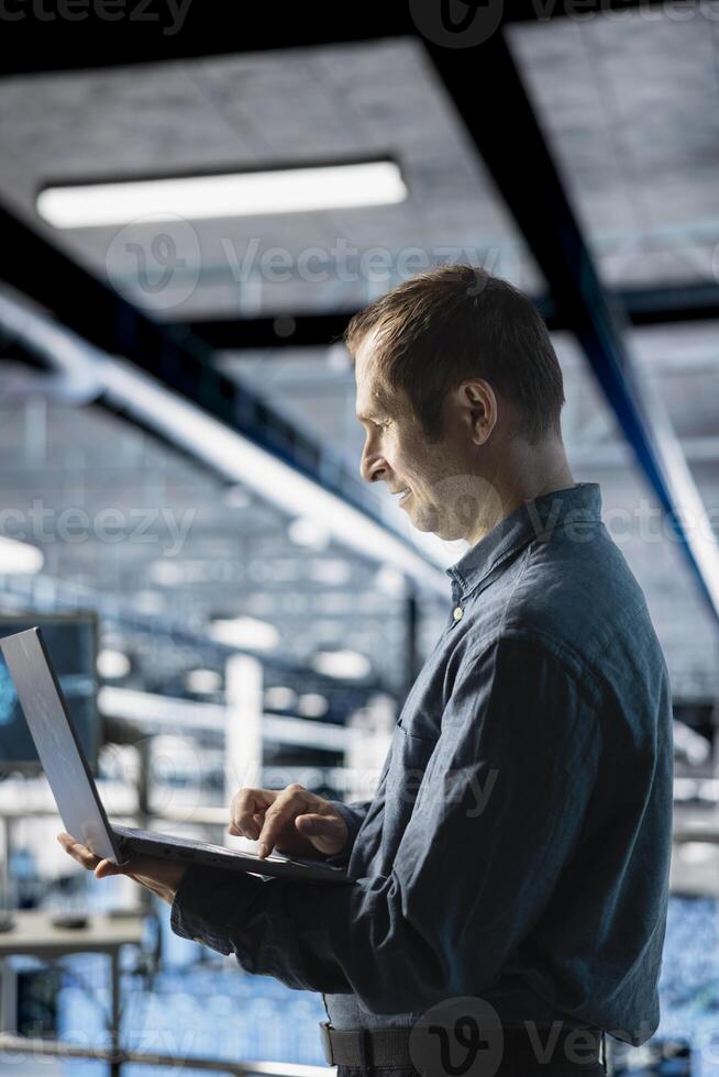 Engineer in data center managing software updates for system stability using laptop. Employee in server farm optimizing performance, configuring infrastructure using application on notebook Pro Photo