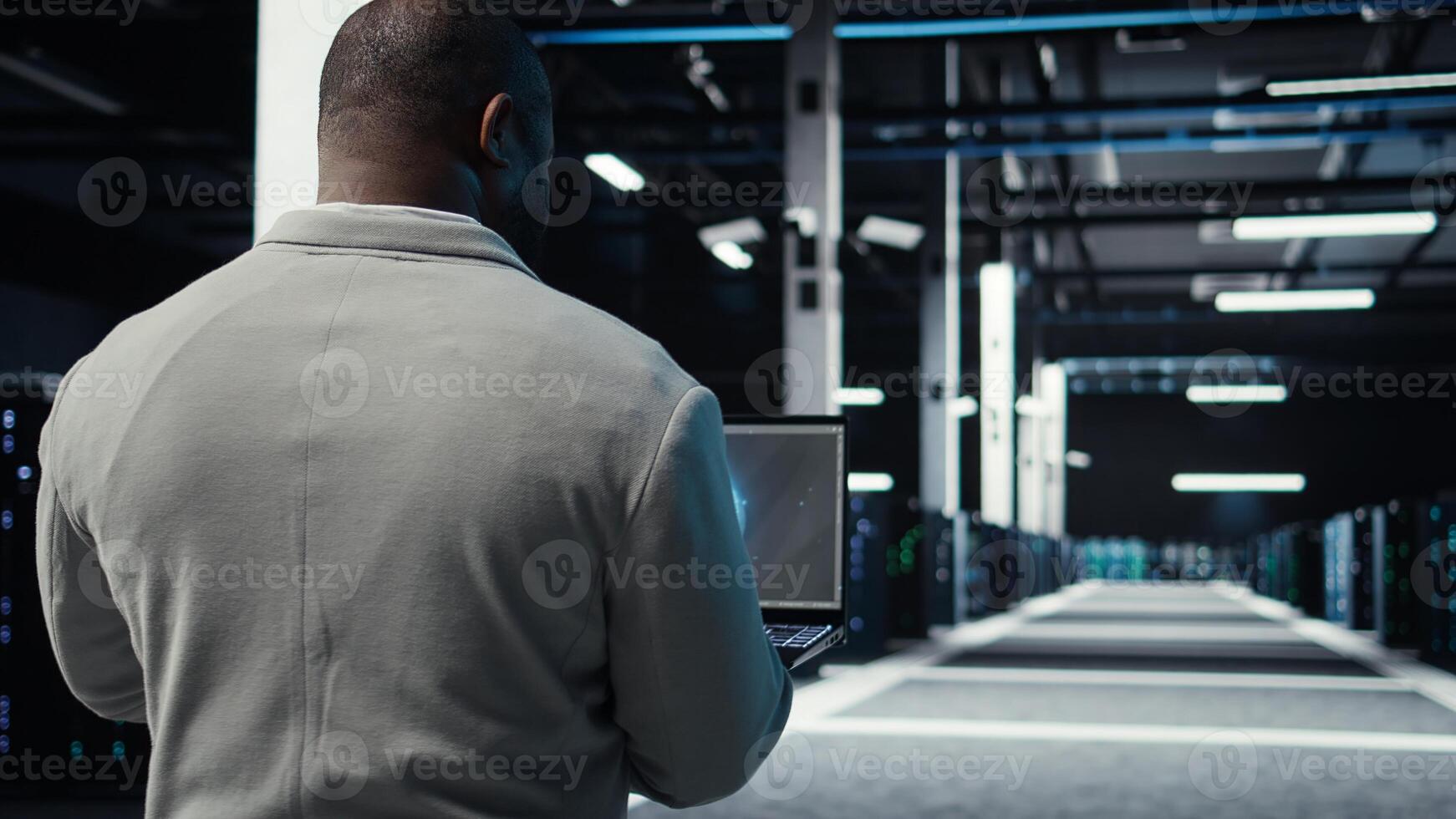 Server room admin using laptop to do infrastructure AI machine learning automatization. Software developer walking in data center doing maintenance using artificial intelligence, camera A Pro Photo