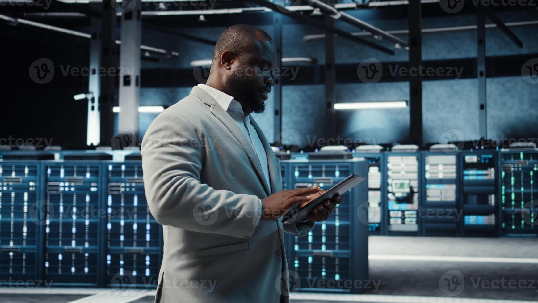 Manager walking in server hub using tablet to find firewall misconfigurations affecting rackmounts performance. Ad,om checking systems bottlenecks leading to sluggish data transfer rates, camera A Pro Photo