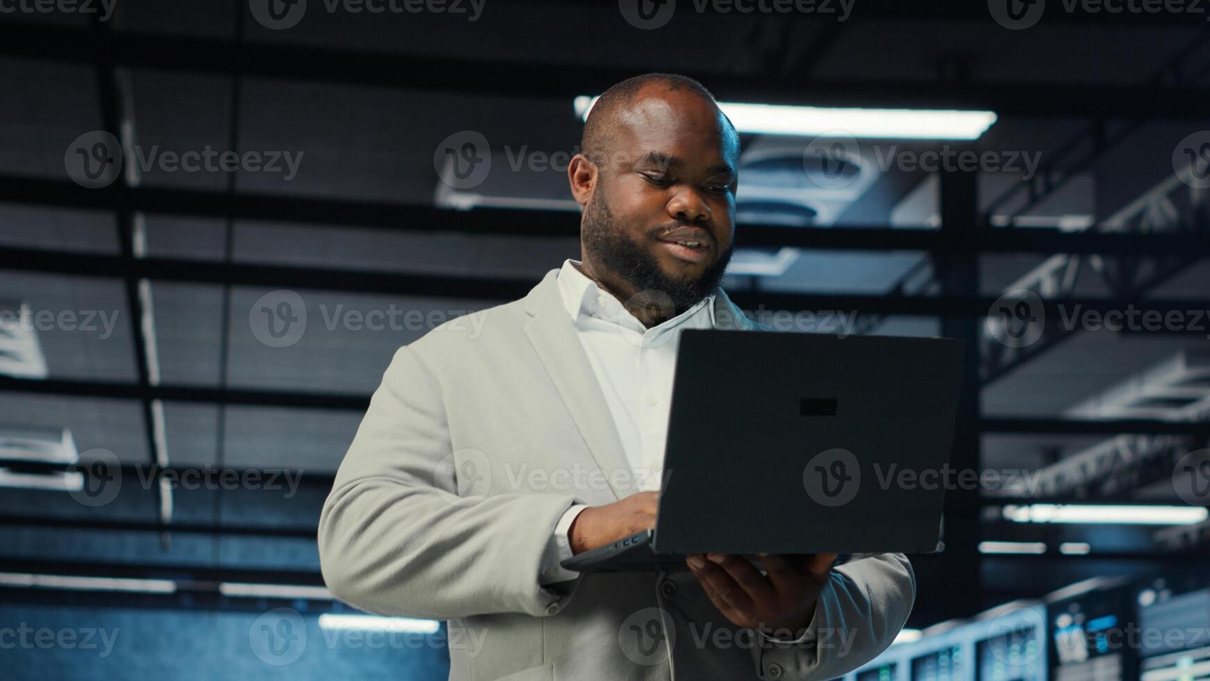 Engineer walking in server room backing up storage arrays using software on laptop. African american data center engineer scanning hardware logs for faults to fix bugs using device, camera B Pro Photo