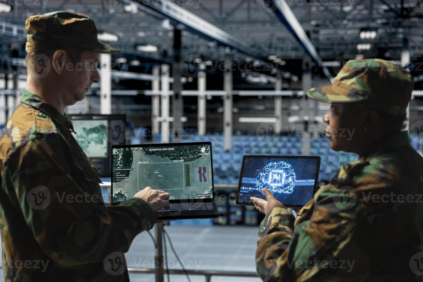 Team of army experts in data center analyzing missiles flight paths with deep learning tools. Military units in server room mapping missile threat zones using AI surveillance platforms Pro Photo