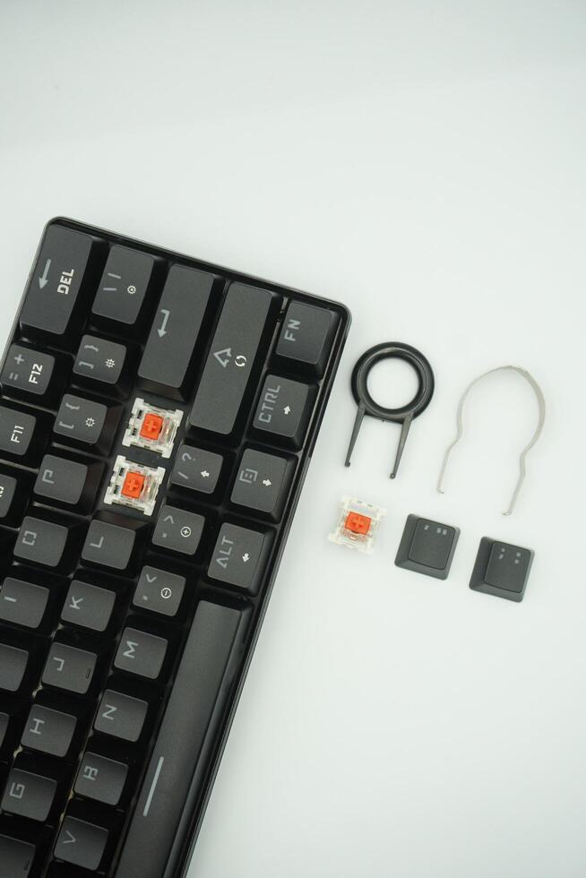 A black mechanical keyboard with a 61 layout with keycaps puller and switch puller and red switches on the side in a white background Free Photo