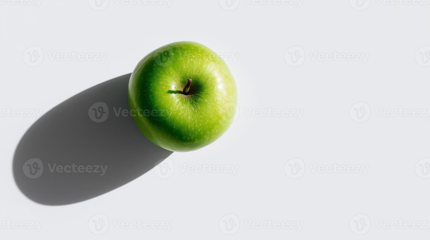 A crisp green apple is placed on a smooth surface, creating a gentle shadow while illuminated. Pro Photo