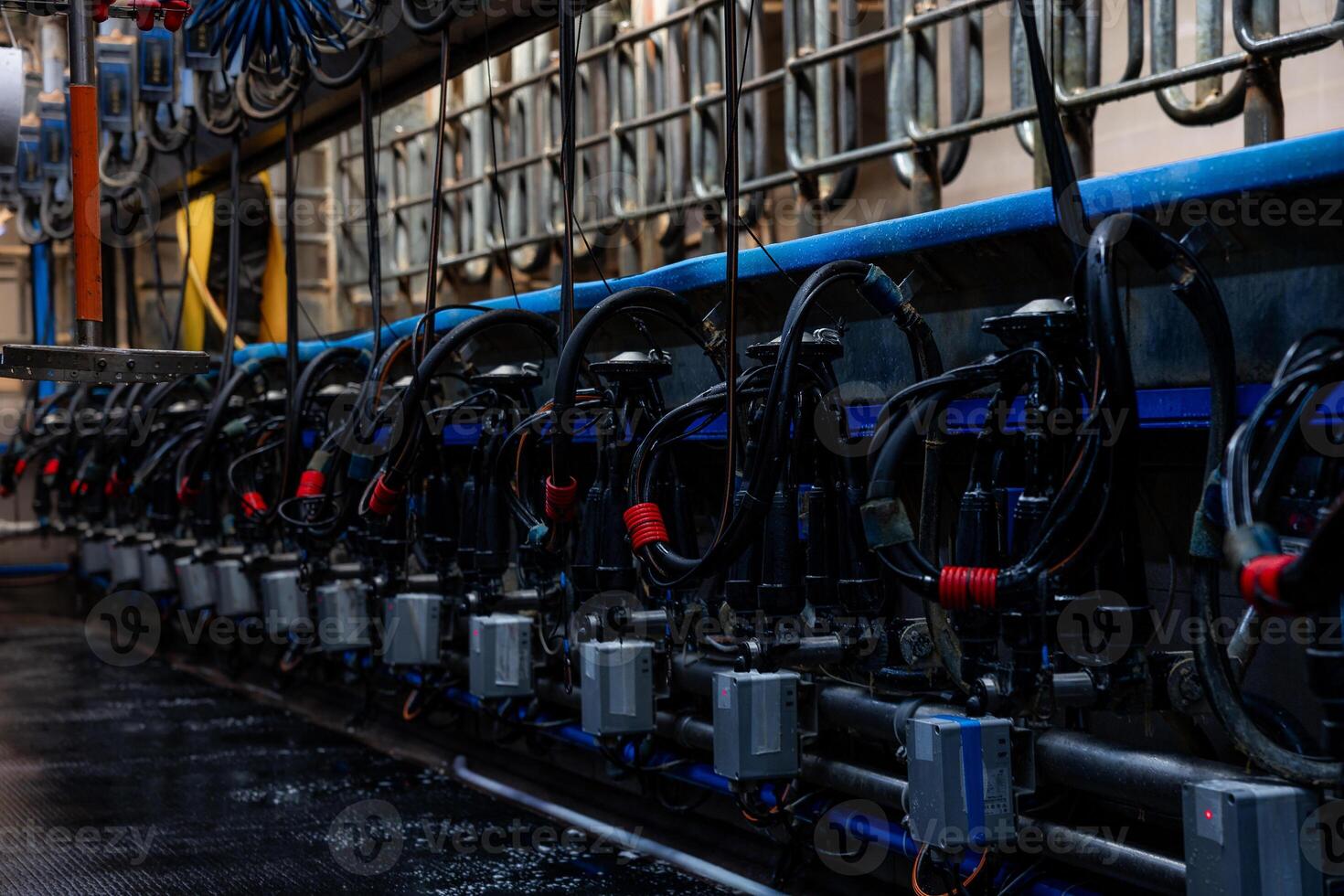 Modern milking parlor setup with rows of milking machines, tubes, hoses, and control boxes. Metal railings and tiled floor highlight functionality. Pro Photo