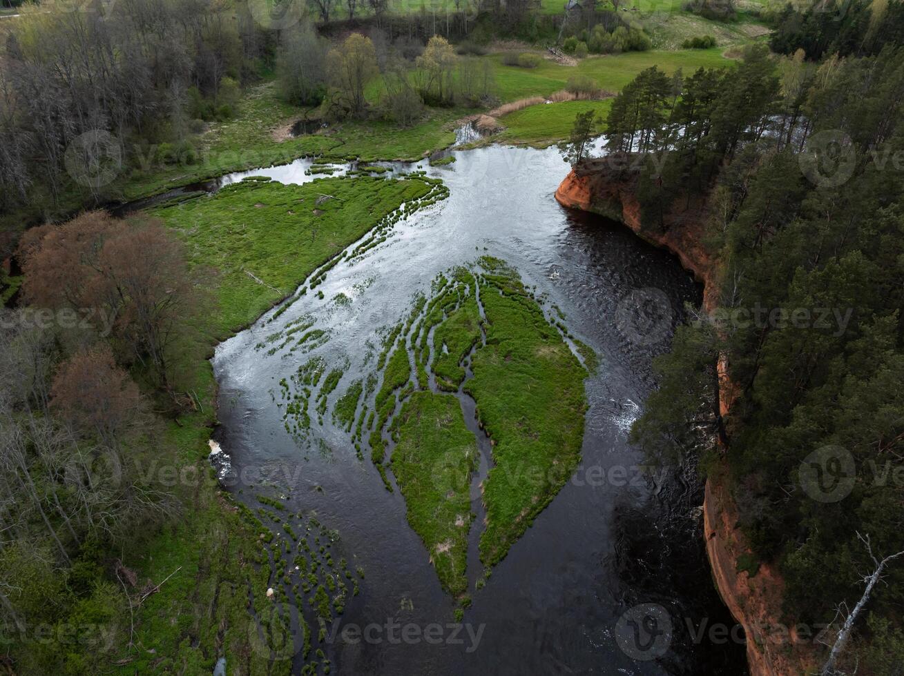 A river flows around a triangular grassy island, bordered by a red sandstone cliff with trees. Open fields and forested areas surround the scene. Pro Photo