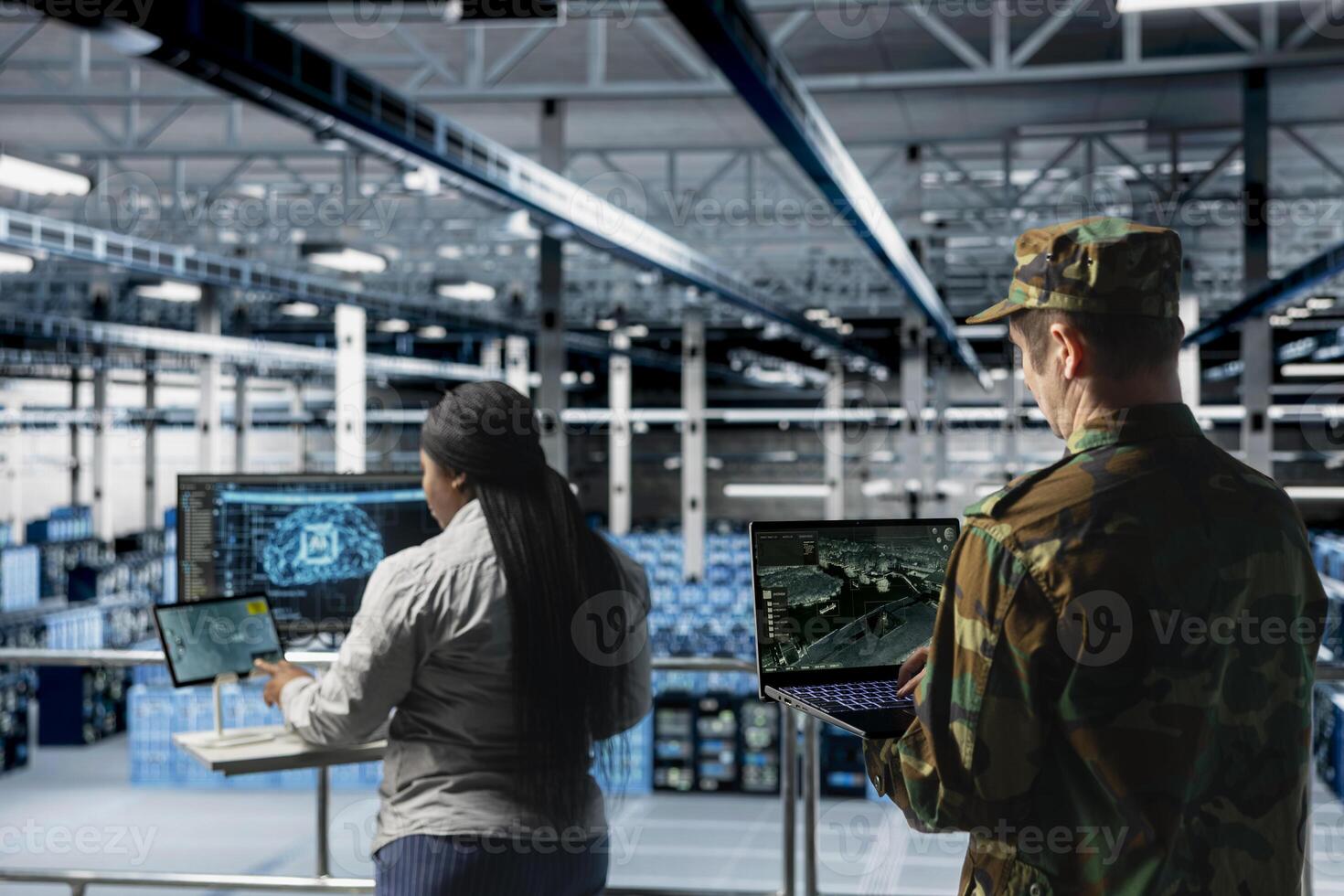 Military units in server room flagging unusual movement using machine learning detection tools. Team of army specialist in data center mapping airborne activity using predictive AI software Pro Photo