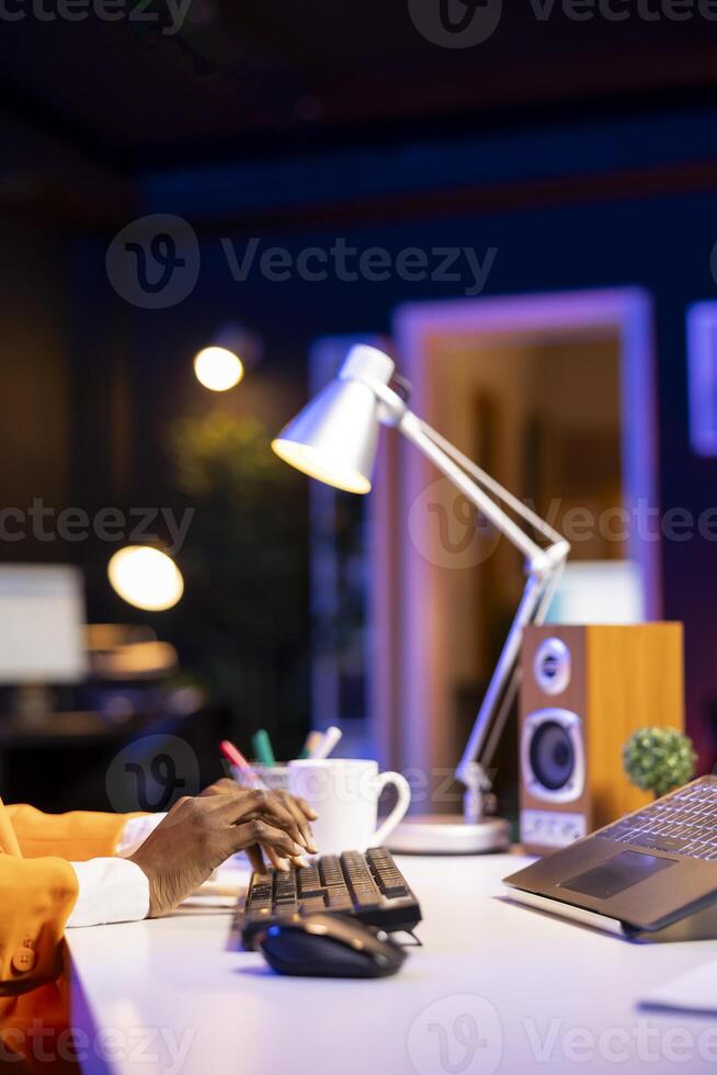 Freelancer working from home, typing on laptop keyboard, writing in document. Close up shot of remote worker pressing keys on notebook keyboard, sending emails to coworkers Pro Photo