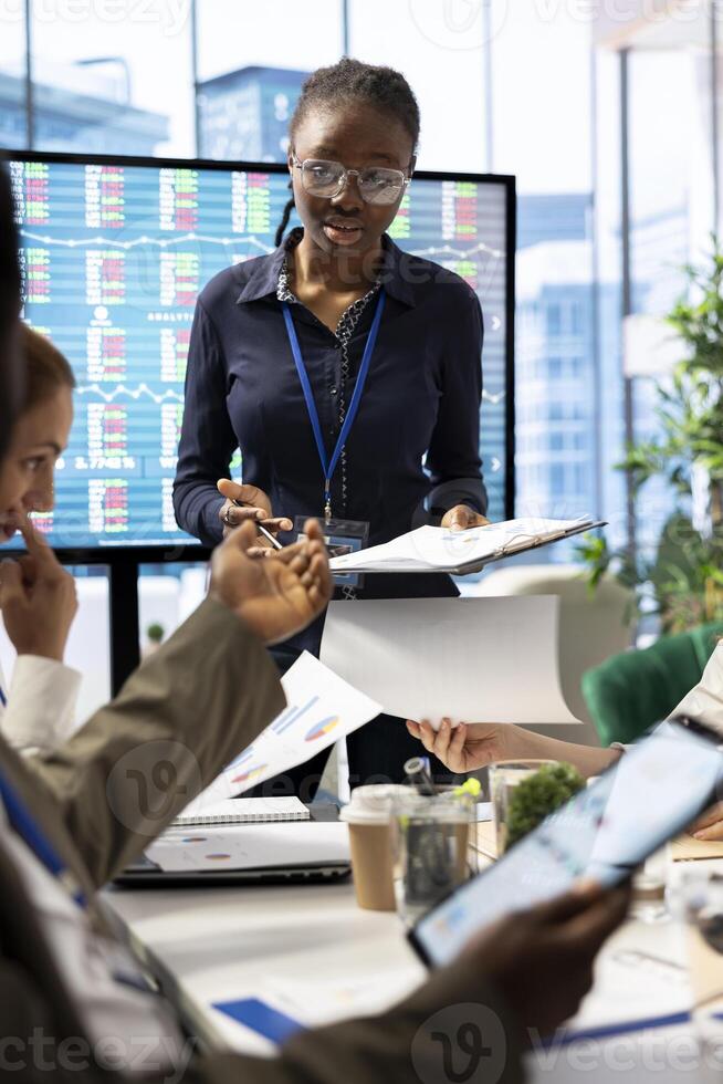 Diverse group of employees participating in a project briefing meeting, discussing workflow optimization and resource allocation. Uniting forces for a successful project execution. Pro Photo