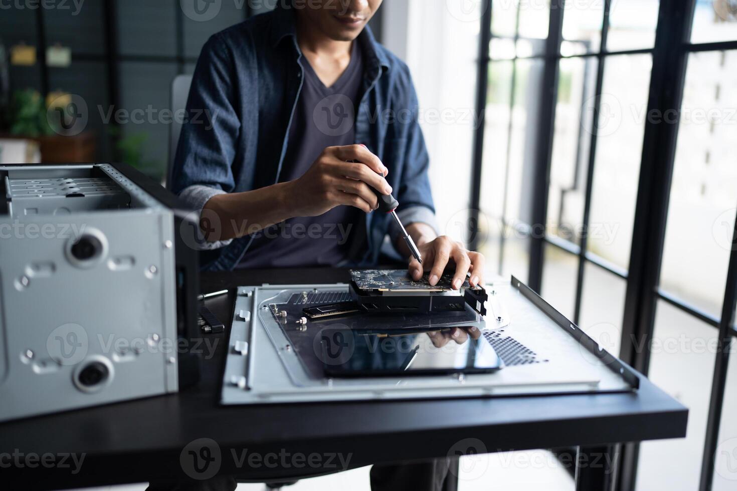 a Engineer installing Hardware working on a computer with a laptop Pro Photo