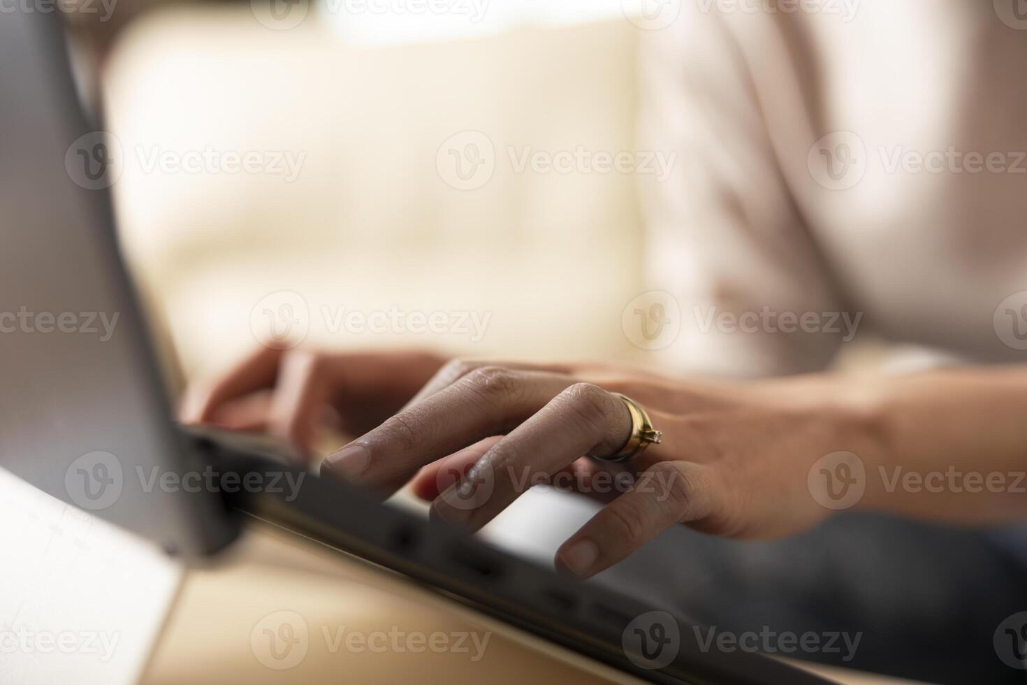 Close up of female hands typing on laptop keyboard, replying to work emails from home. Selective focus showing remote work routine with individual updating business reports and project proposals. Pro Photo