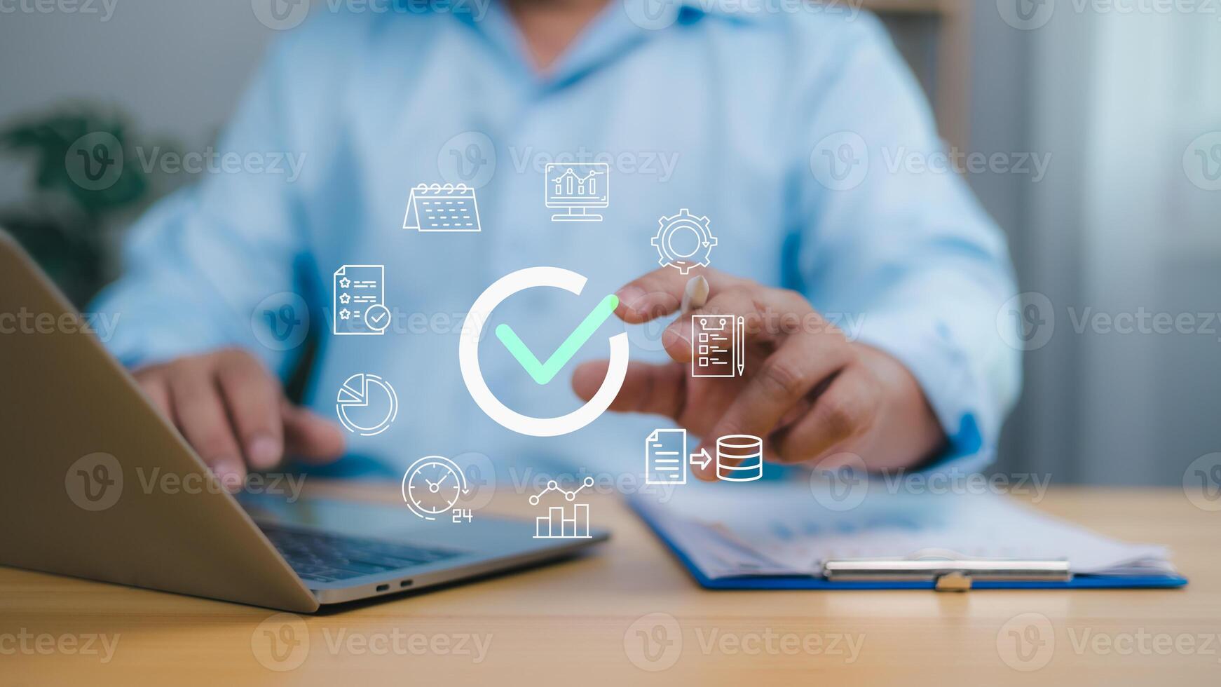 Person using a laptop with a large checkmark icon and business related icons calendar, graph, symbolizing process completion, quality assurance, efficient management, and successful project delivery. Pro Photo