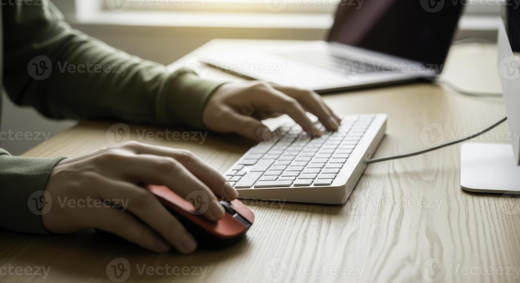Man hands typing on a computer keyboard and using a red mouse on a wooden desk. Pro Photo