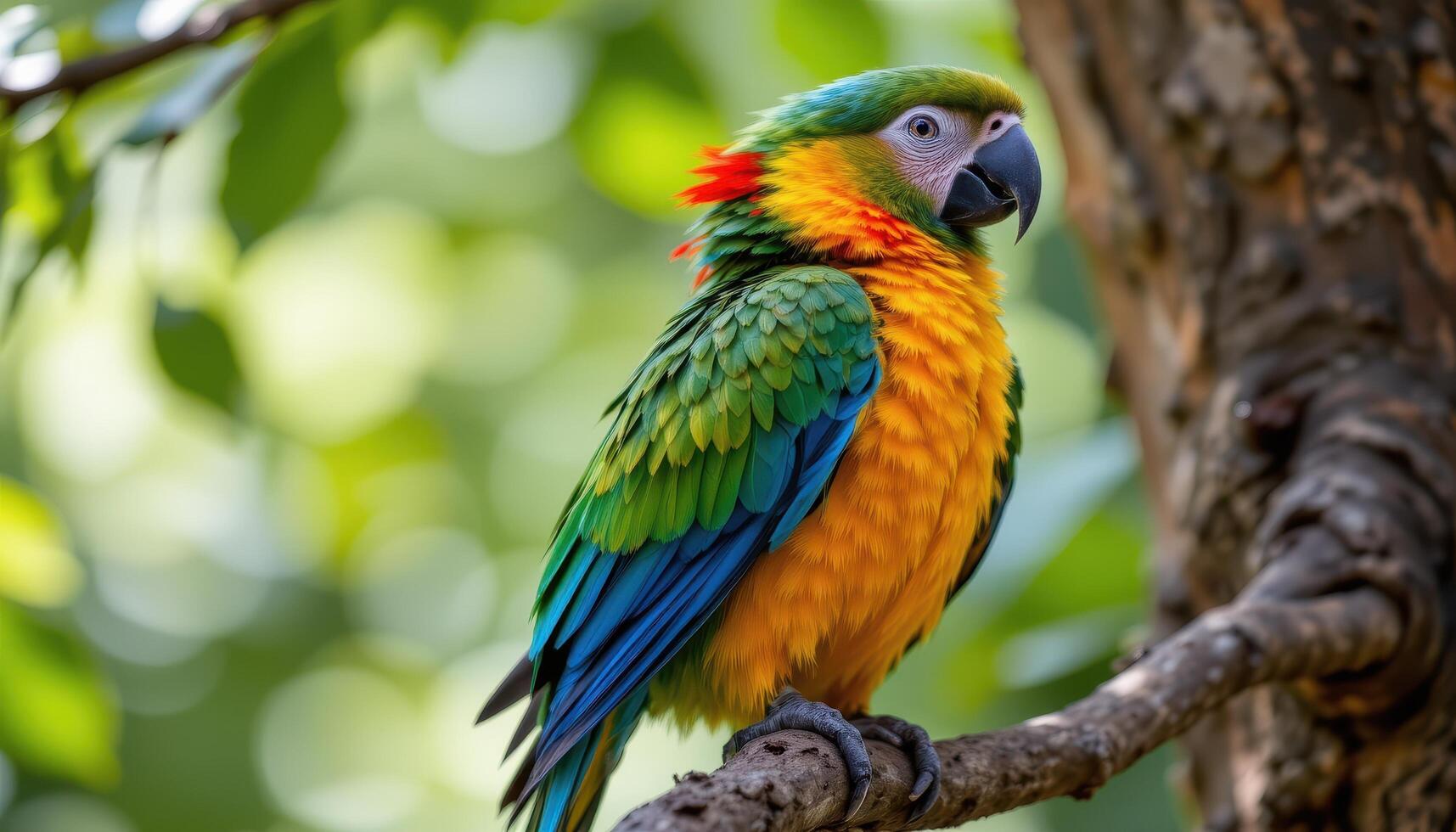 close up view of a bright and colorful parrot perched peacefully on a tree branch, the intricate feather patterns visible in soft ambient light. photo