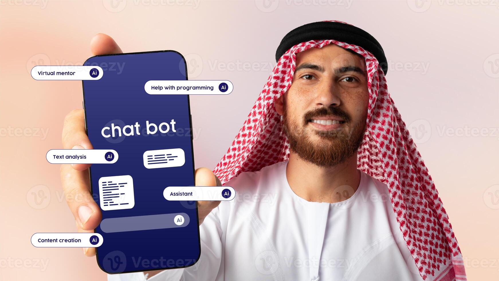 Man holds smartphone displaying chat bot functions in a virtual assistant demonstration Pro Photo