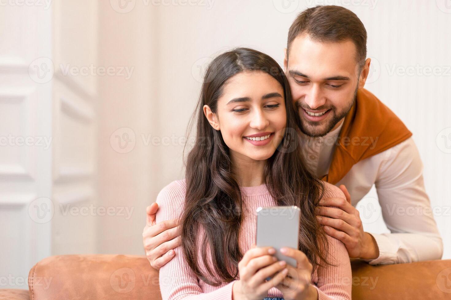 Modern arab couple using mobile phone app browsing internet sitting on sofa at home. Cheerful millennials texting via cellphone networking indoors. Smartphone application, communication Pro Photo