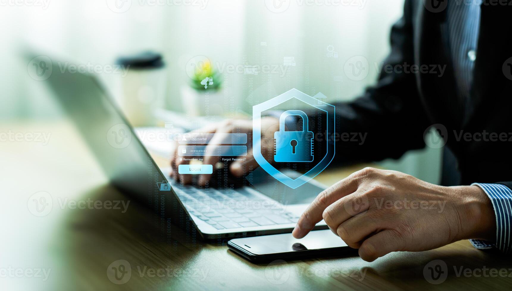 Cybersecurity and multi-device protection concept with businessman logging in securely on smartphone and laptop. Digital shield, secure access, and information security for online identity safety. Pro Photo