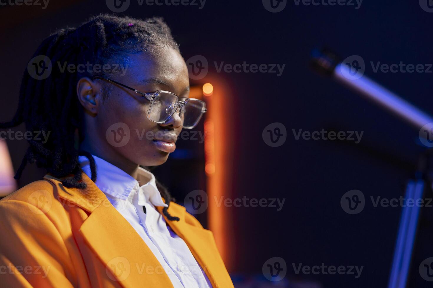 Teleworker in home office checking analytics statistical data sets on laptop. African american remote employee optimizing key performance indicators in apartment workspace Pro Photo