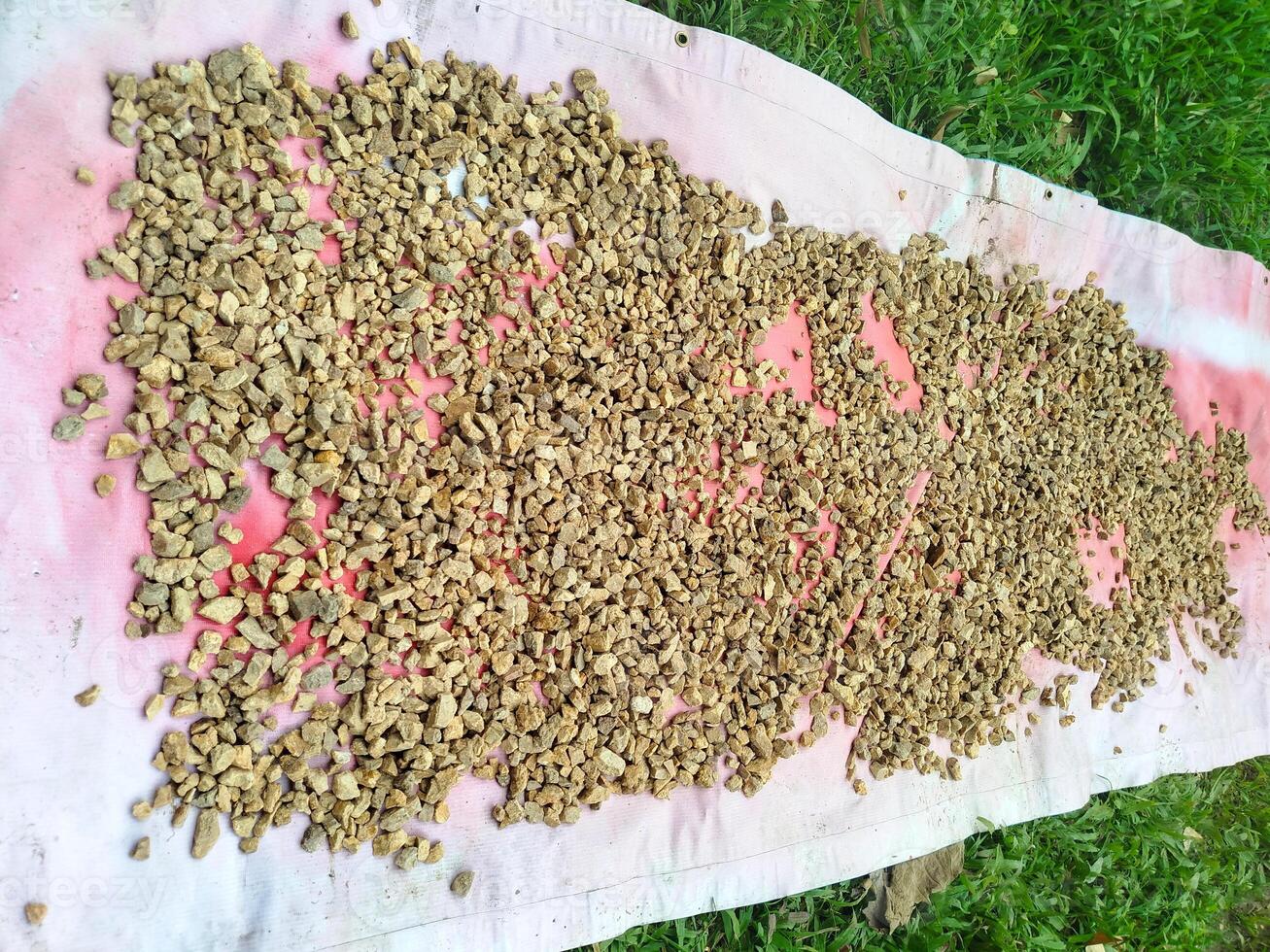 a Samples of gravel and soil on a white canvas from which surveyors collected samples of rock and soil layers in the area where the railway will be built. Pro Photo