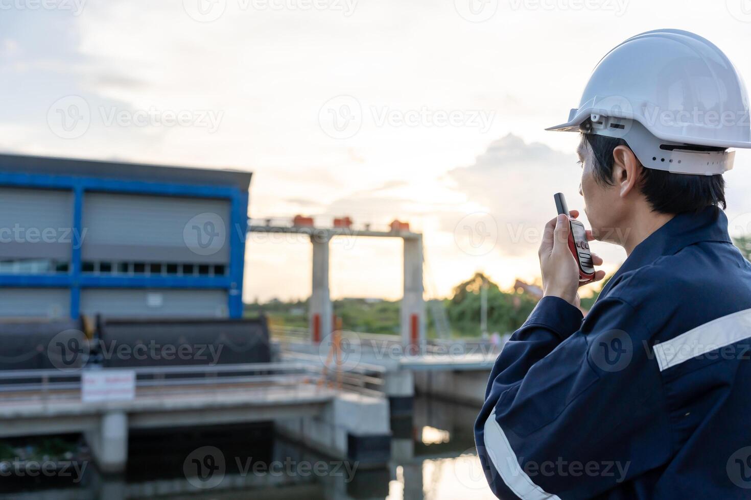 maintenance and inspector. Maintenance engineers are using walky talky to inform the results of inspection of buildings and structures. Irrigation engineers are exploring sluice system, Pro Photo