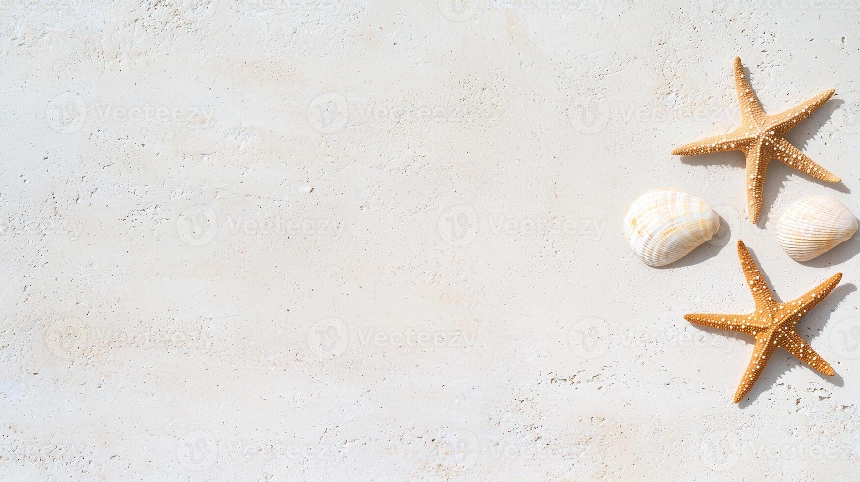 Various with and a starfish are arranged on a white textured stone surface, forming a border seashells empty space in the center Pro Photo