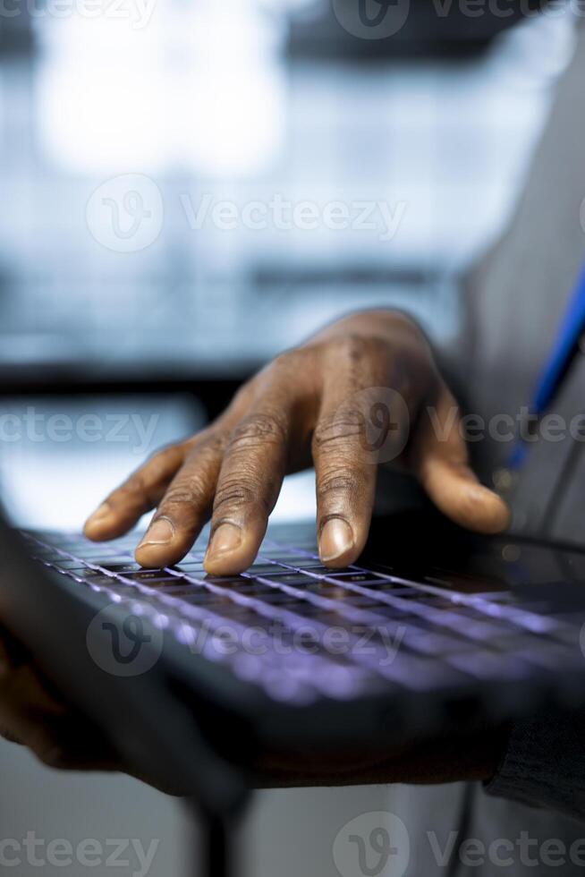 Programmer in data center facility typing on laptop keyboard, configuring rigs. Close up of IT specialist using notebook in server farm, verifying settings to maintain stable performance Pro Photo