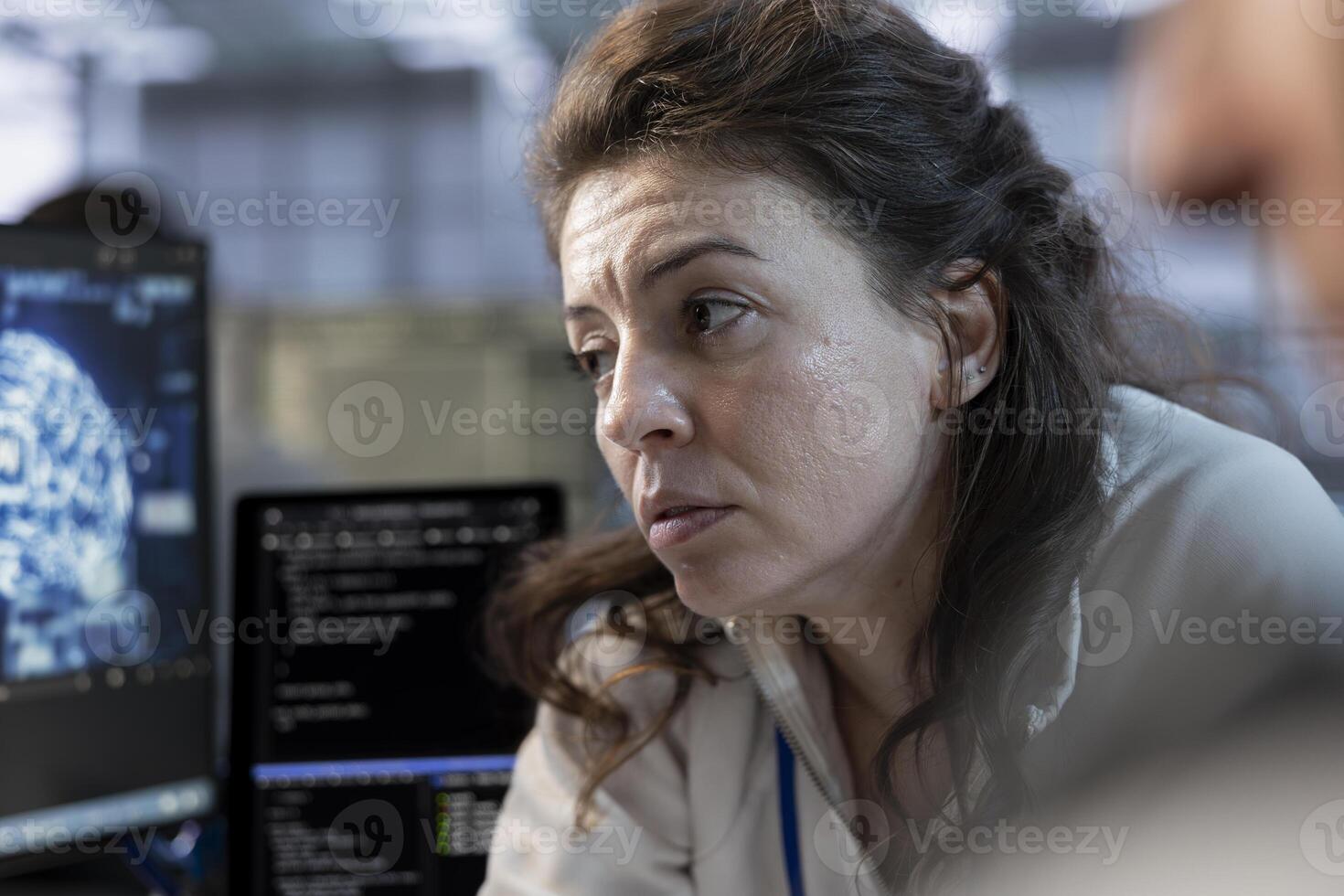 Programmer doing data center workplace automation using AI and machine learning tools. IT worker integrating artificial intelligence driven automation in server hub facility operations Pro Photo