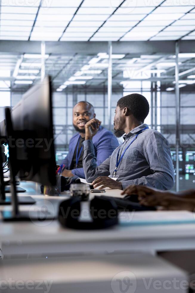 Team of engineers chitchatting in data center while running system diagnostic tests and error checking utilities. Coworkers looking for network issues affecting server performance and connectivity Pro Photo