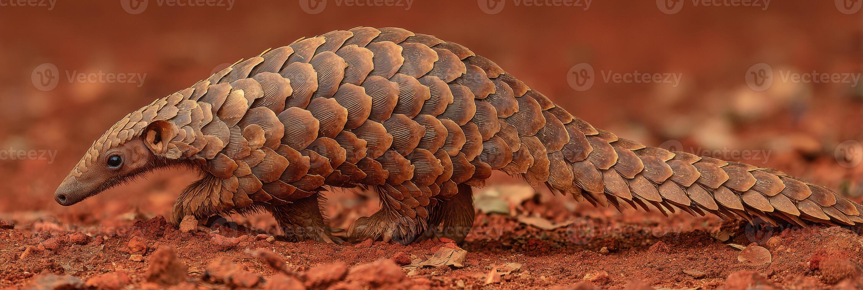 Indian Pangolin Walking on Reddish Soil With a Minimal Background, Showcasing Its Unique Scales and Form During a Sunny Day in the Wild Pro Photo