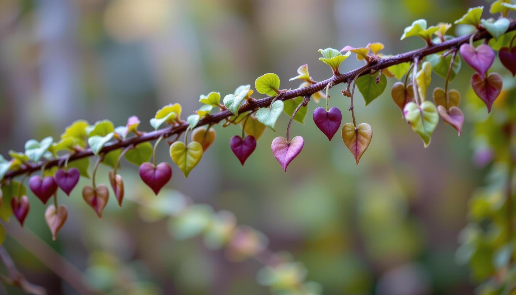 close up view of trailing string of hearts with tiny heart shaped leaves in dusty green and purple tones on long cascading vines Free Photo