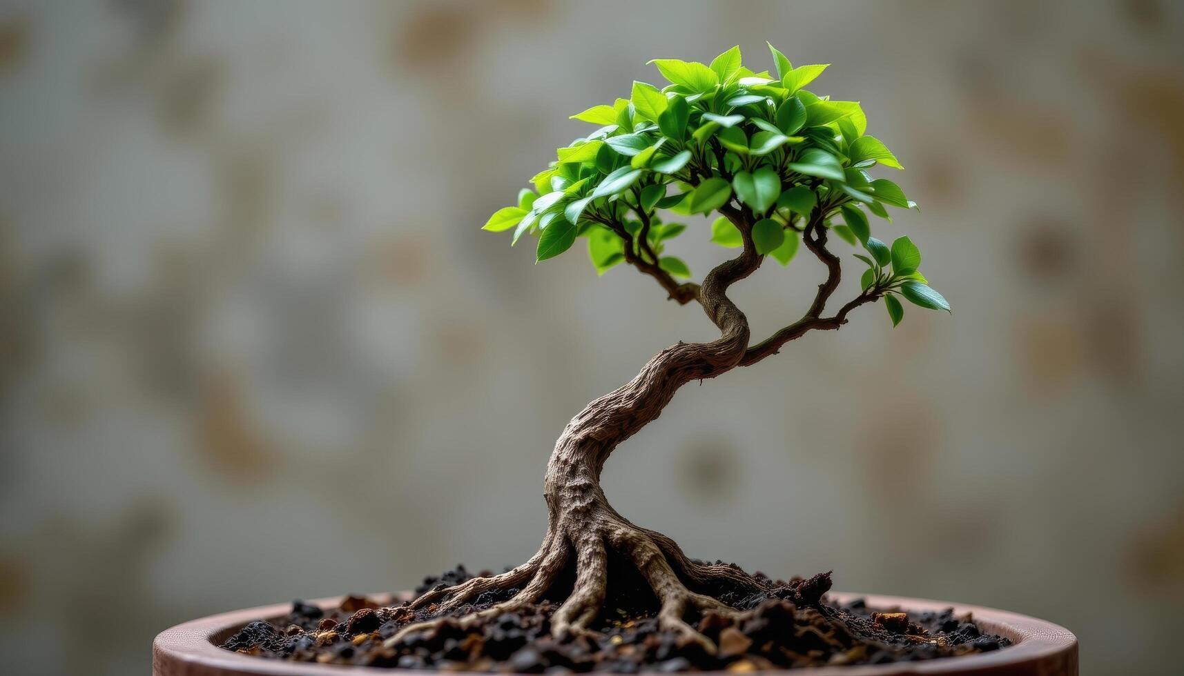close up view of a twisted ficus ginseng trunk with dense leafy crown forming a miniature tree silhouette Free Photo
