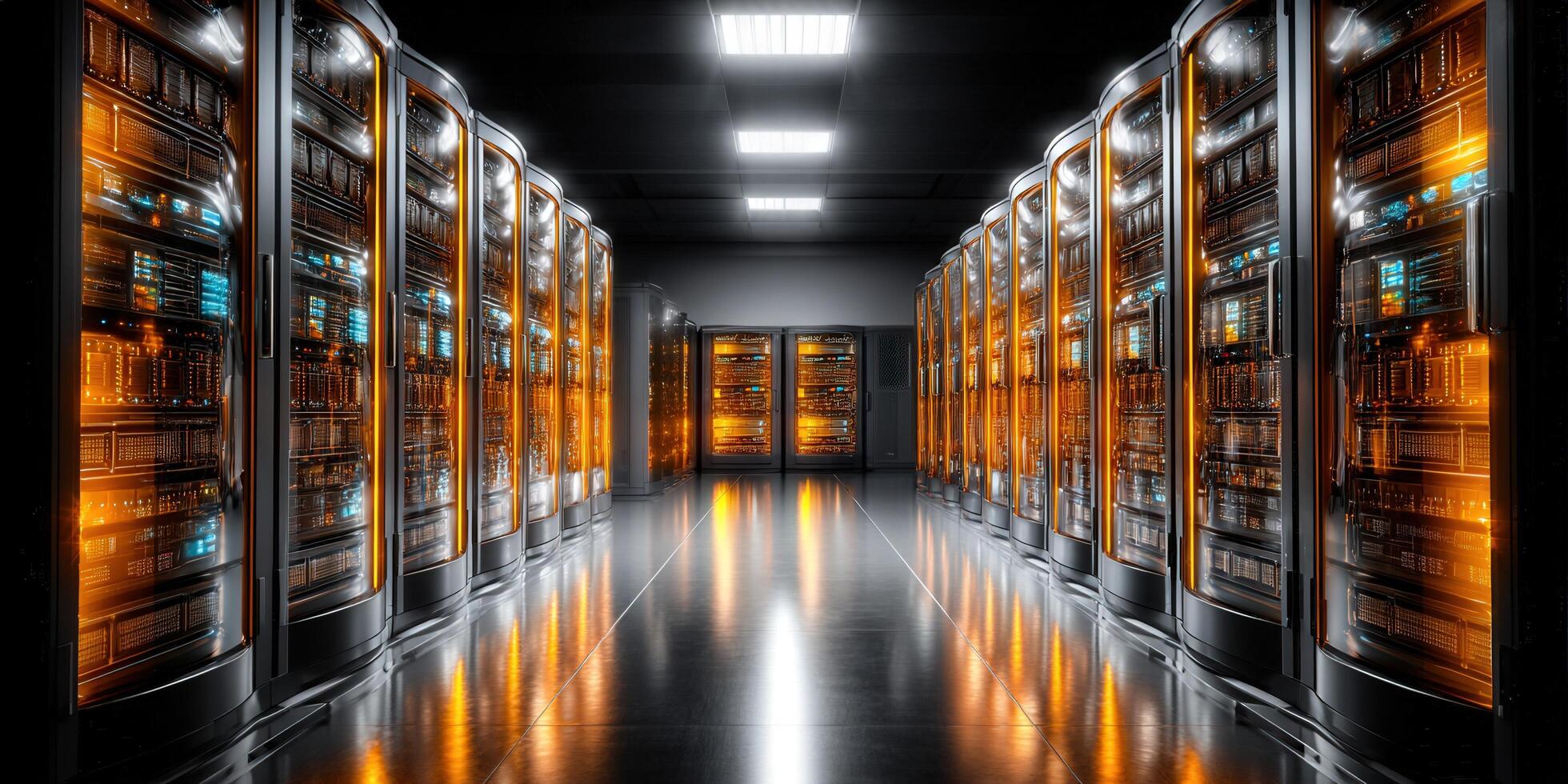 Inside a cutting-edge server room, showcasing powerful data processing technology. photo