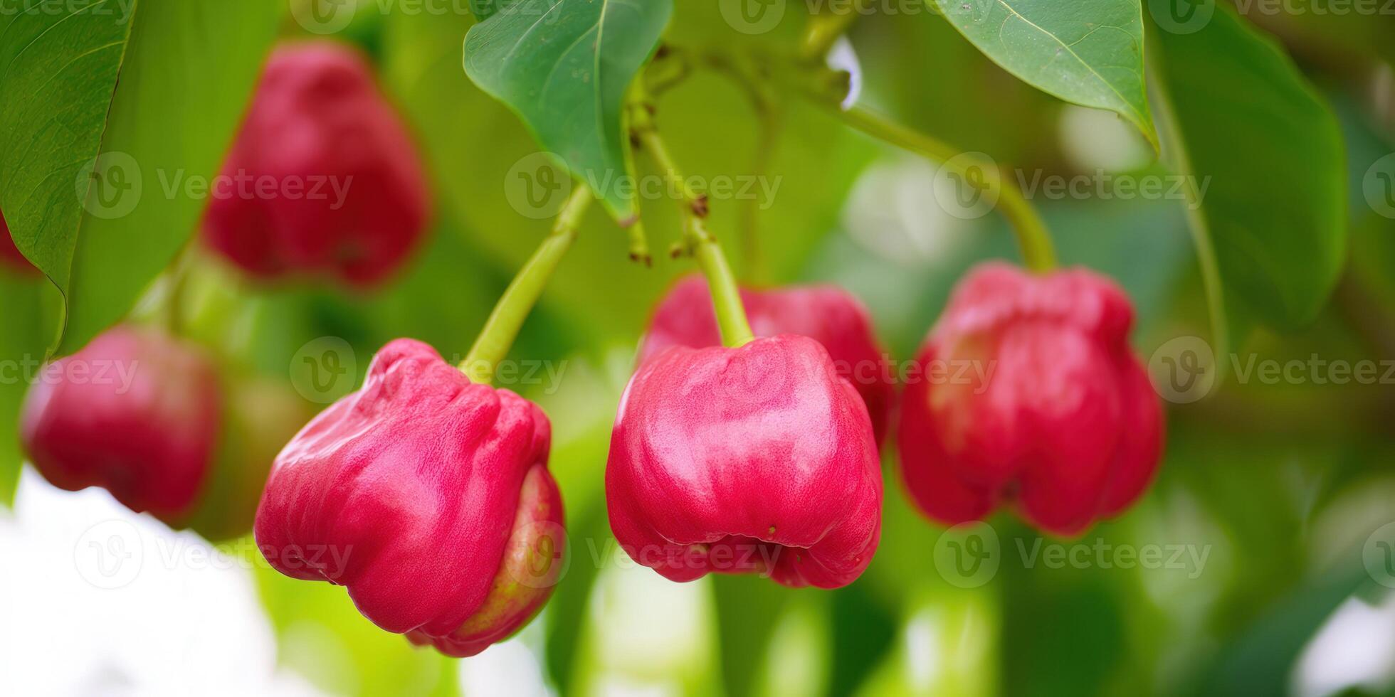 A cluster of ripe, vibrant red java apples thriving on a tree. Pro Photo