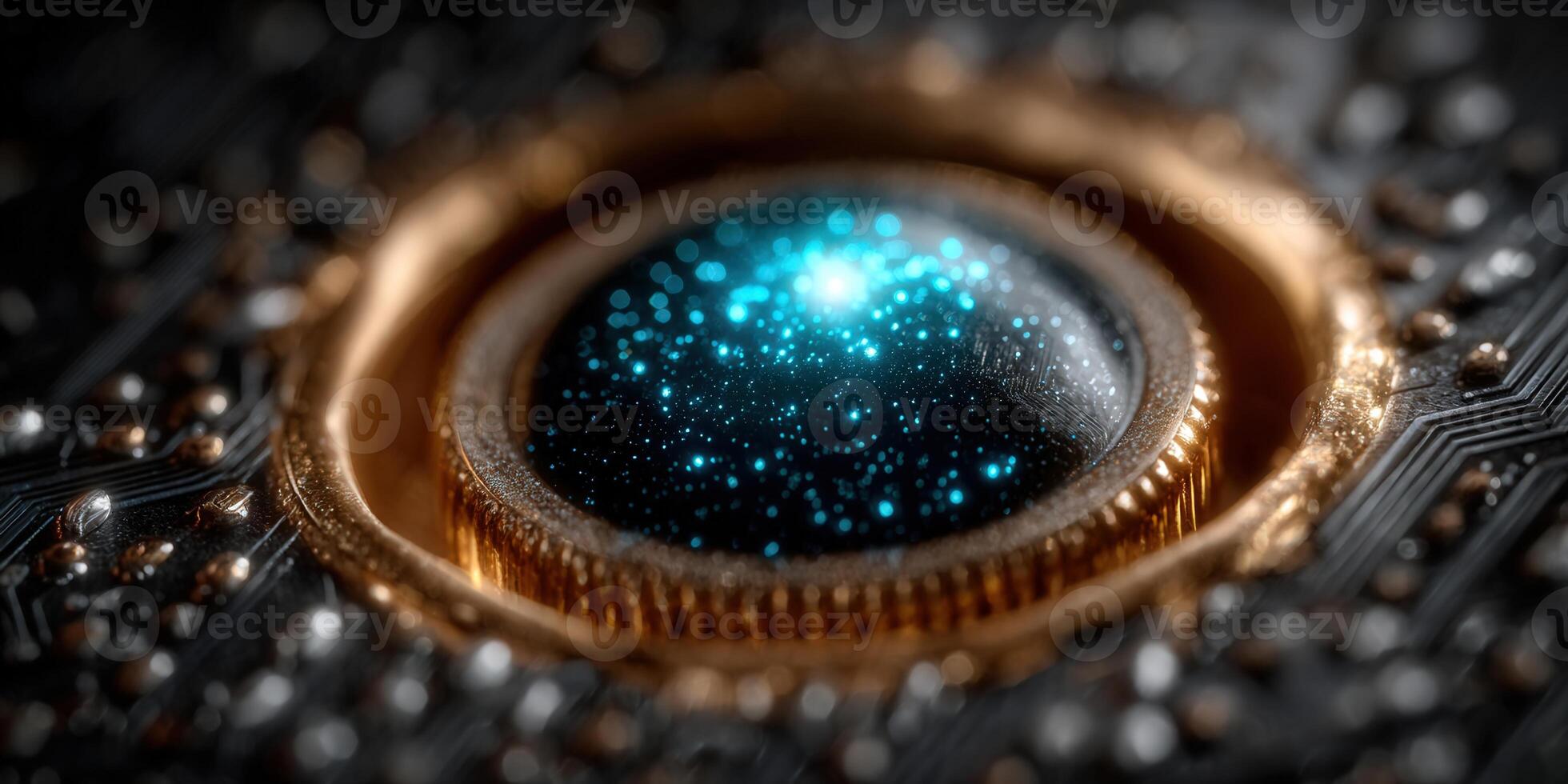 Intricate circuit board with glowing blue core, representing advanced technology and digital innovation. Pro Photo