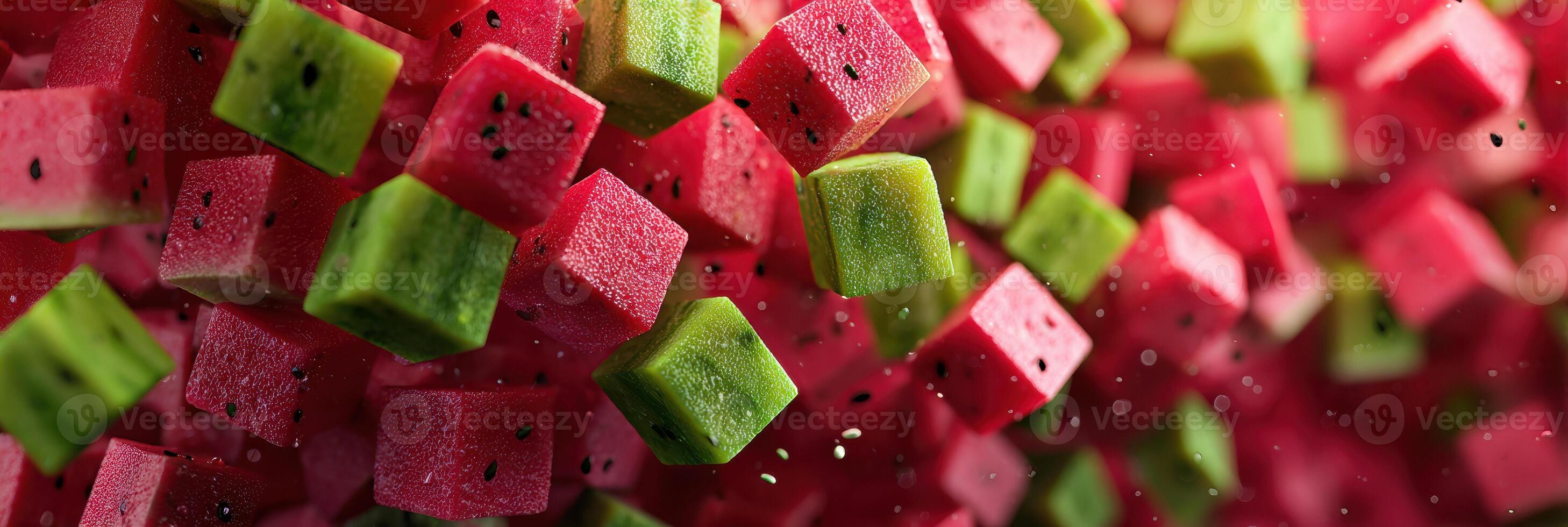 Abstract Structure of Watermelon Cubes Creating a Dynamic Visual Arrangement With Open Space Above Pro Photo