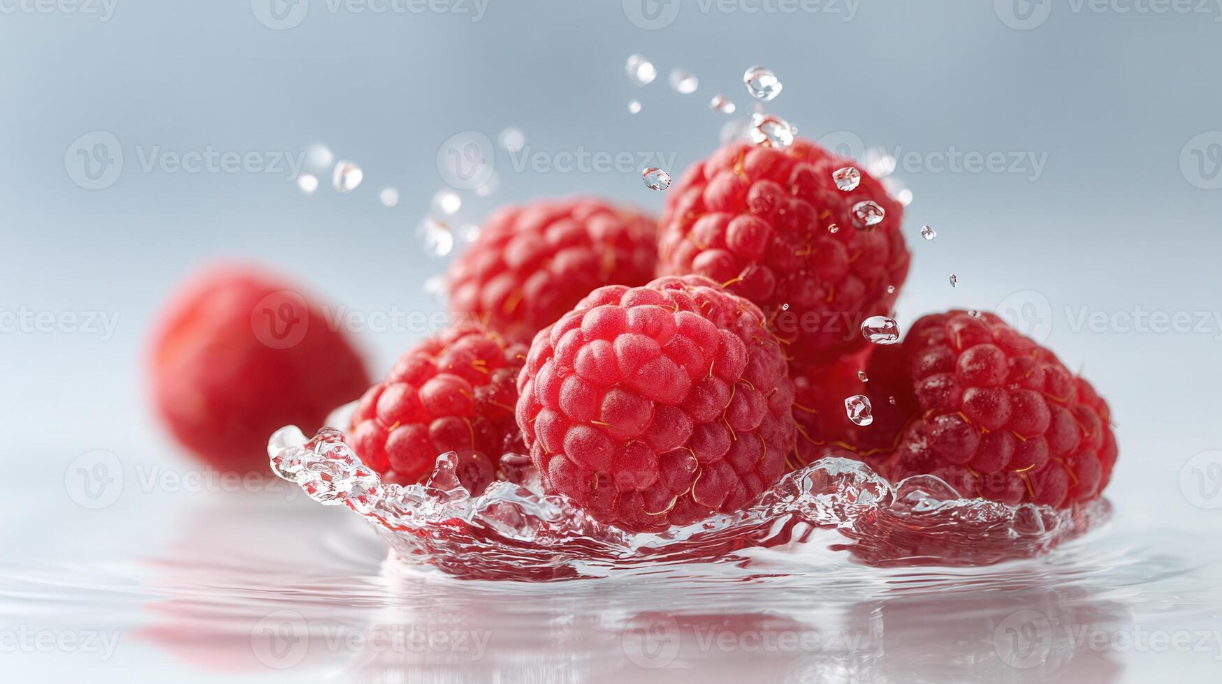 Ripe fresh, dropping into clear water, splashing dynamically and highlighting raspberries nutritious produce Pro Photo