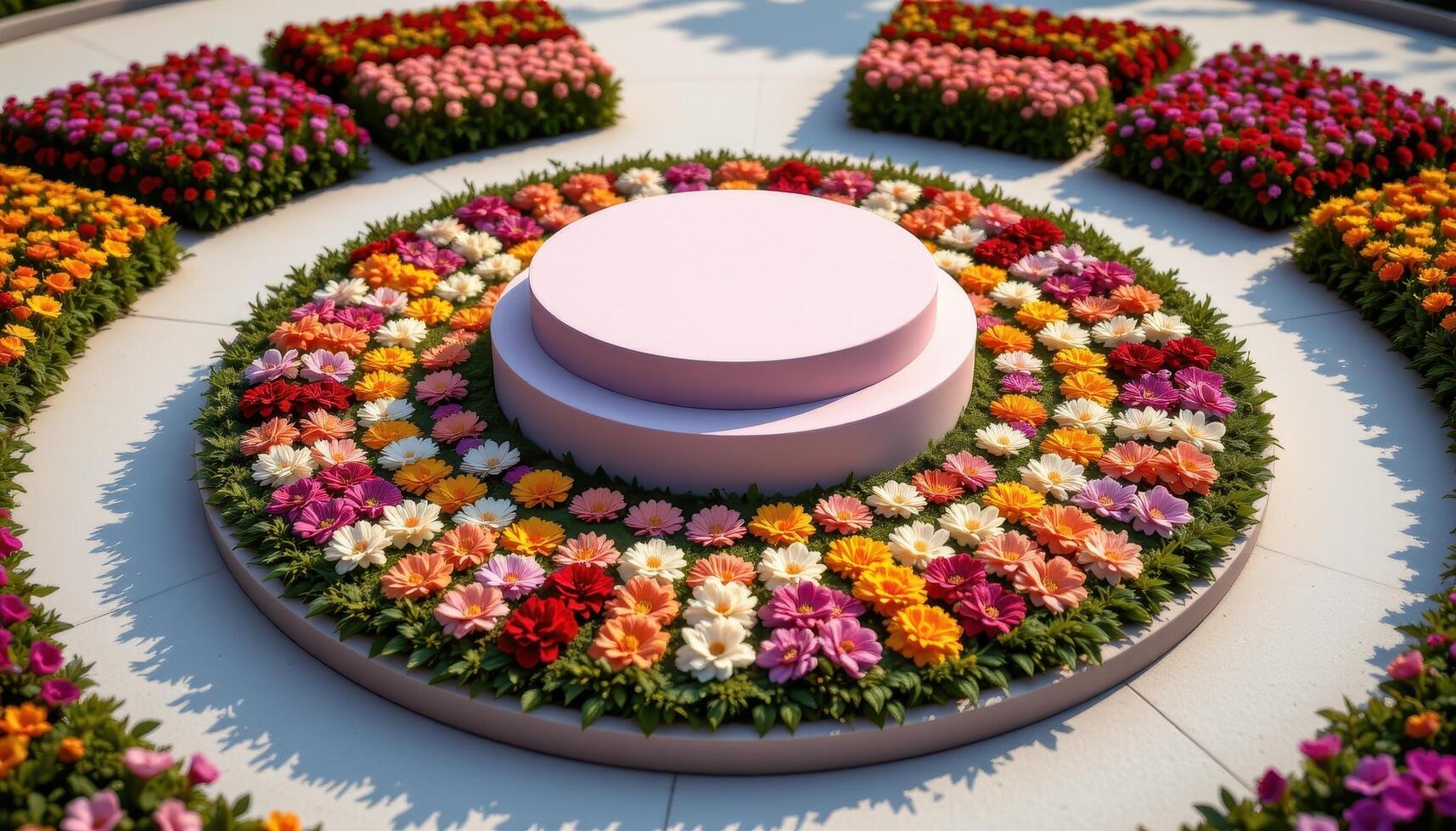 close up view of a podium encircled by circular flower beds with petals arranged in mandala like patterns, radiating outward in symmetry and color harmony Free Photo
