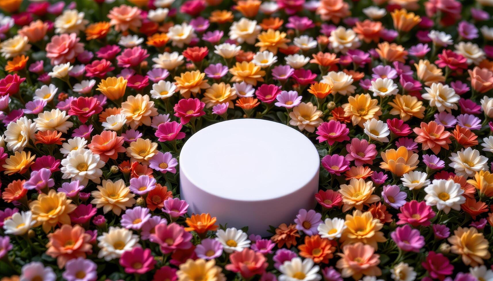 close up view of a podium in the center of a radial pattern formed from flowers organized by stem length and hue. Free Photo