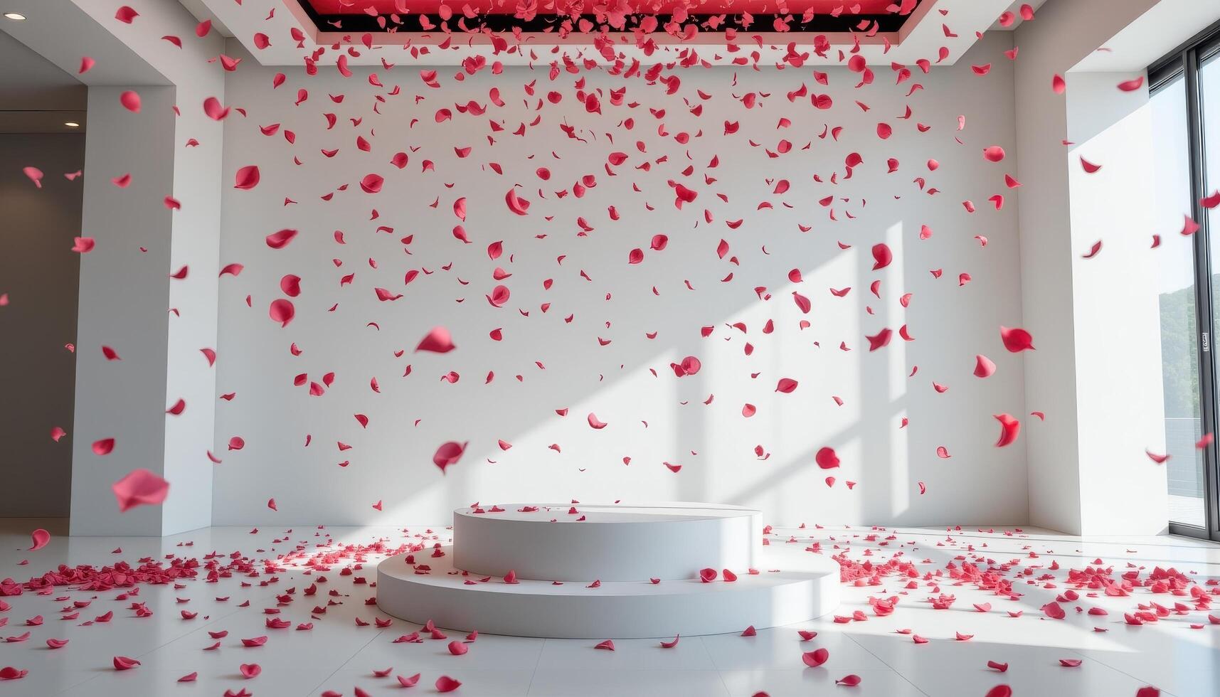 close up view of a podium inside a clear room with petals raining slowly from the ceiling in endless loop. Free Photo