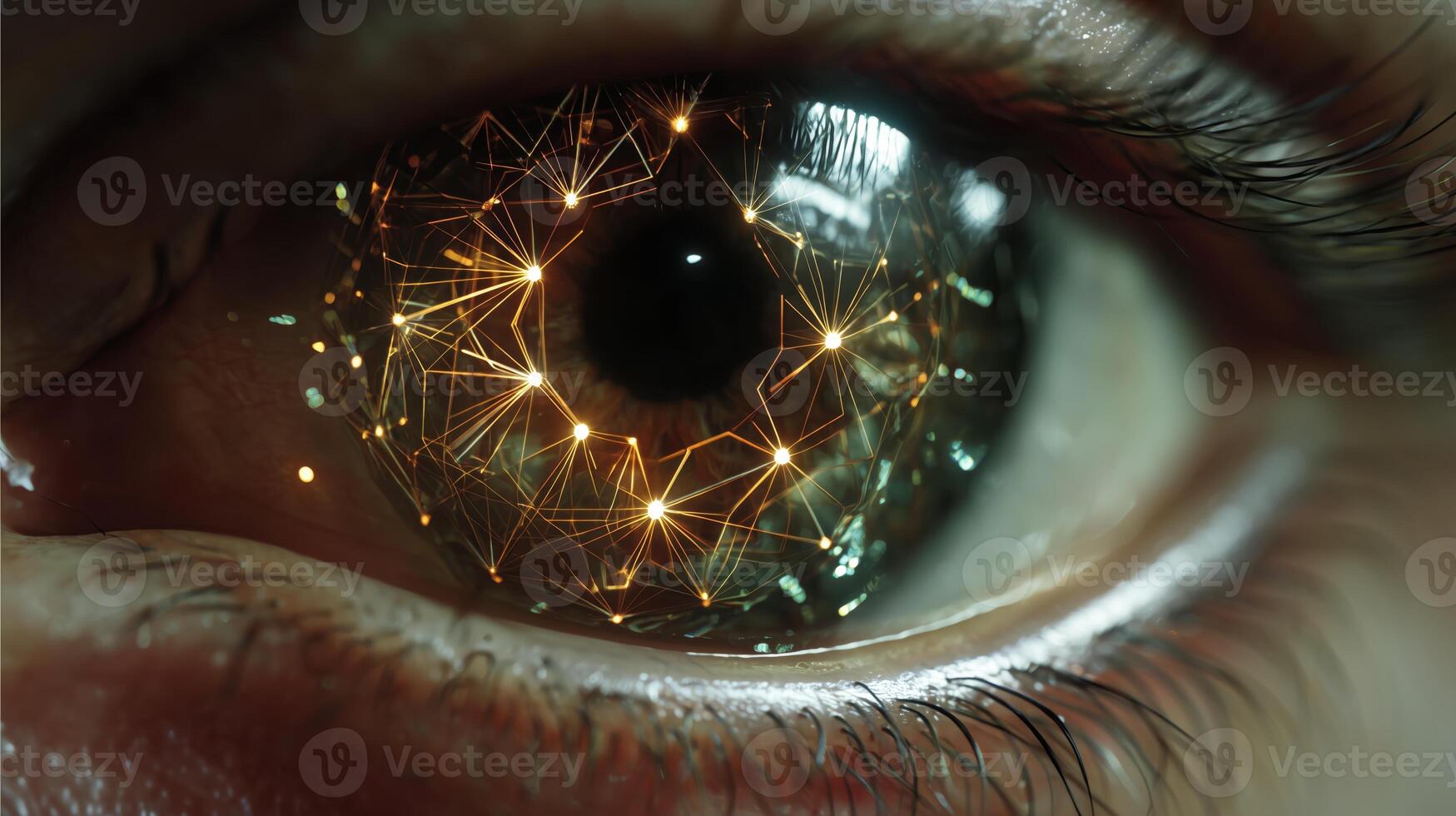 A close-up of an eye shows intricate connections and patterns created by biometric technology. The clock ticks as advanced algorithms process biometric data for security purposes. Pro Photo
