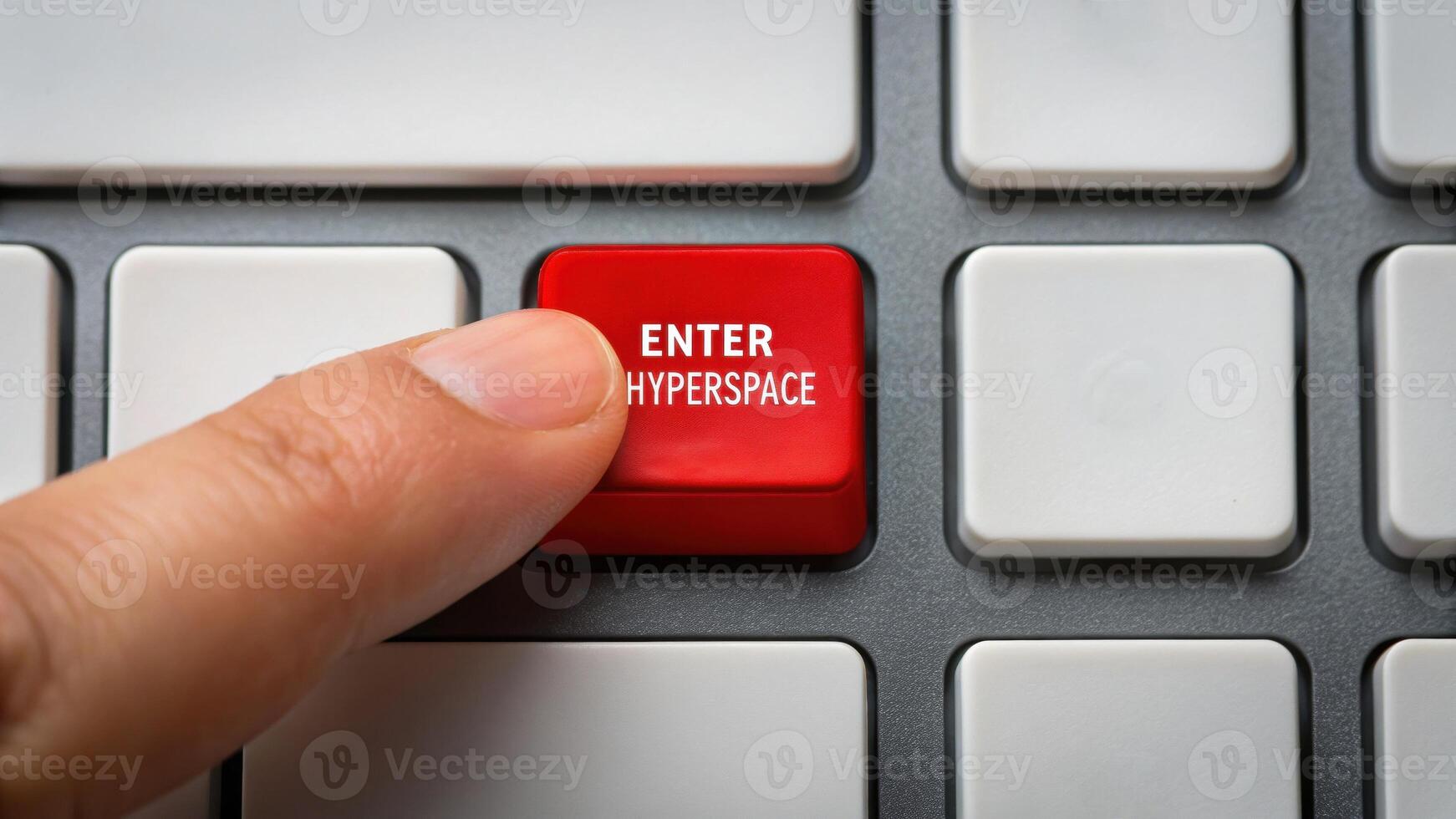 A finger presses a red keyboard key labeled ENTER HYPERSPACE on a modern computer keyboard. Pro Photo