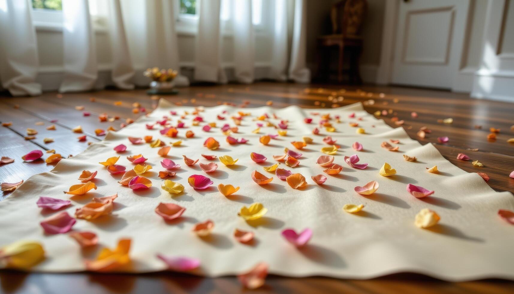 a long scroll of paper unrolled across the floor with flower petals pressed into every section. Free Photo