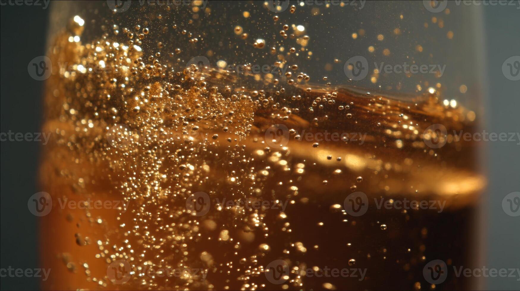 Close-Up of Bubbles Rising in a Glass of Fizzy Drink with Brown Color and Sparkling Effect Captured in Soft Focus Pro Photo