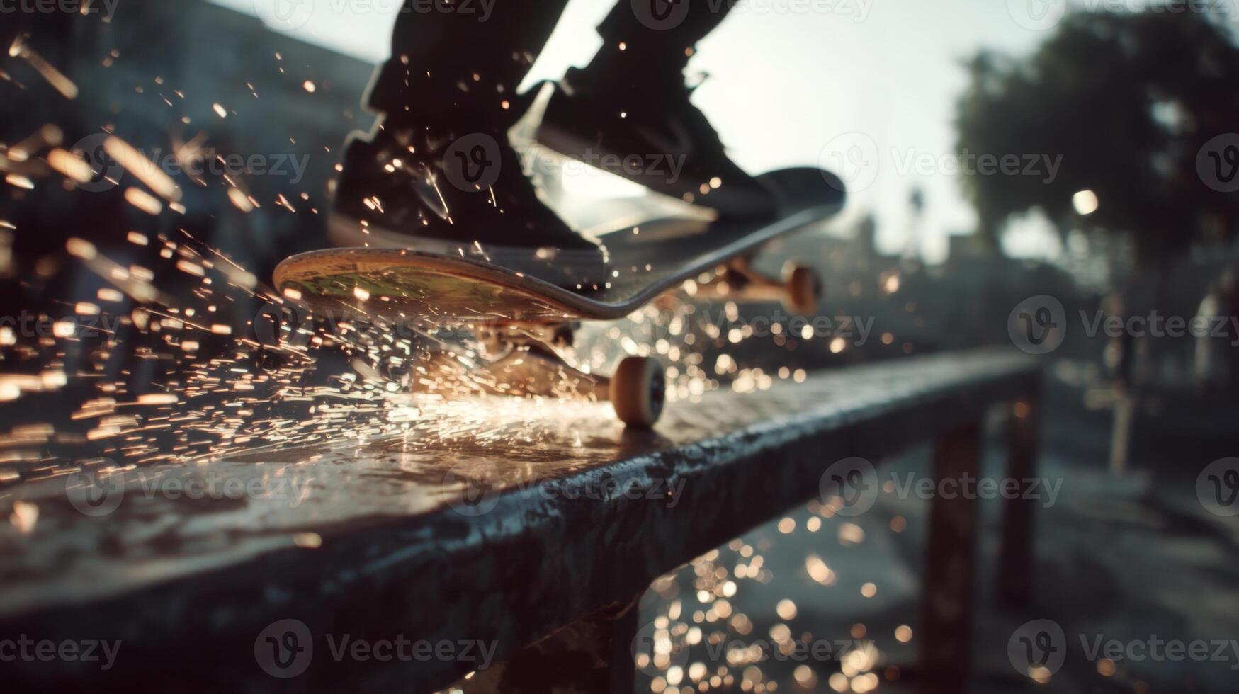 Skateboarder Performing Trick in Urban Setting with Sparks Flying from Grind on Rails Pro Photo