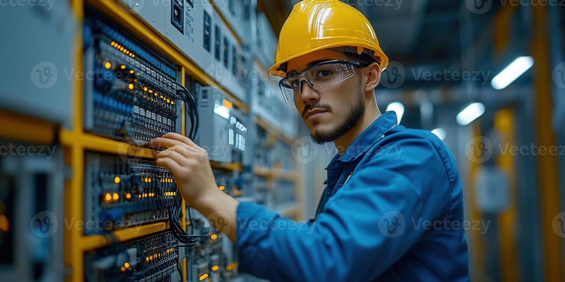 A technician in safety gear inspects a server rack in an industrial setting, ensuring network functionality. Pro Photo