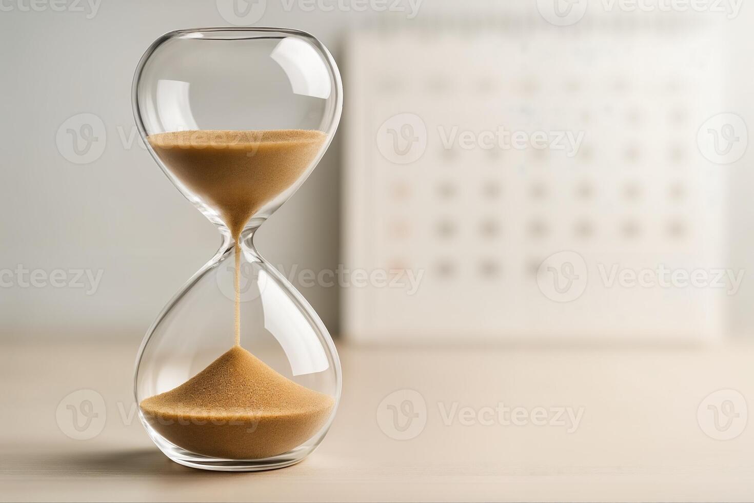 Hourglass With Flowing Sand on Table in Front of Blurred Wall Calendar Symbolizing Passage of Time and Future Planning Pro Photo