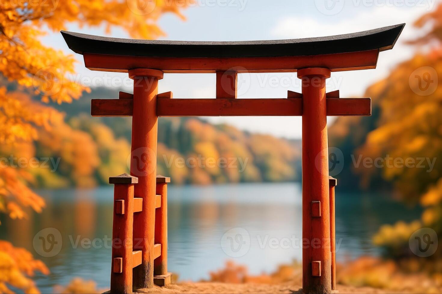 Torii Gate Surrounded by Vibrant Autumn Foliage with Calm Lake in Background Creating a Serene and Picturesque Scene Pro Photo